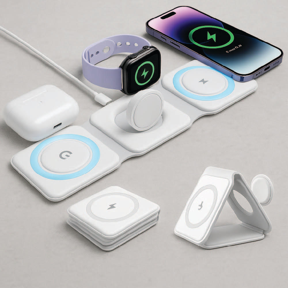Simultaneously charge your smartphone, Air Pds, and smartwatch with dedicated charging spots for each device